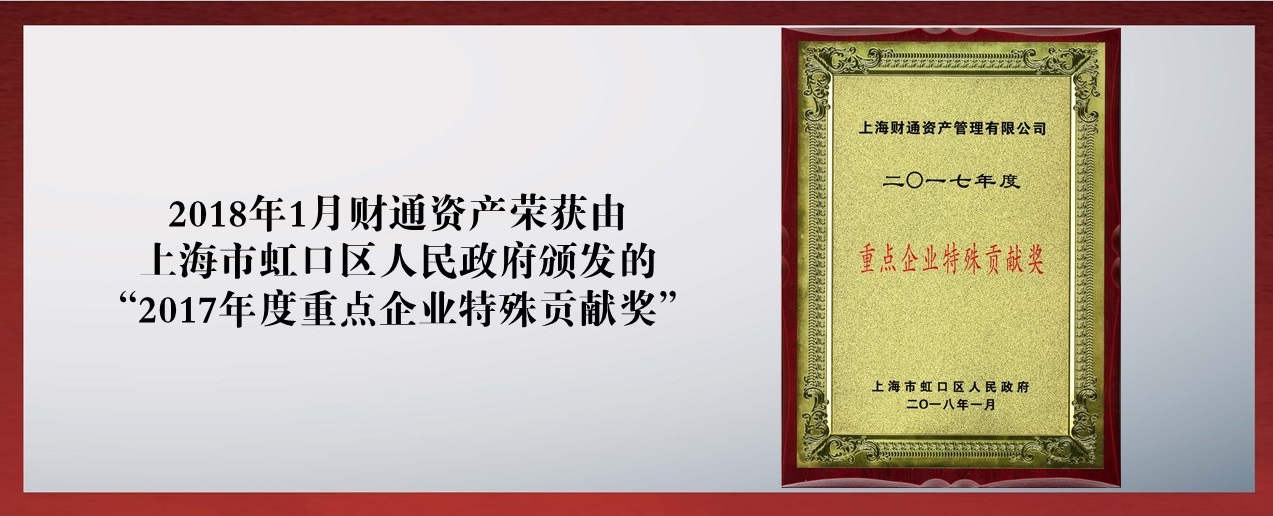 2018年(nián)1月(yuè),财通(tōng)資産榮獲由上(shàng)海(hǎi)市(shì)虹口區(qū)人(rén)民(mín)政府頒發的(de)“2017年(nián)度重點企業(yè)特殊貢獻獎”;
