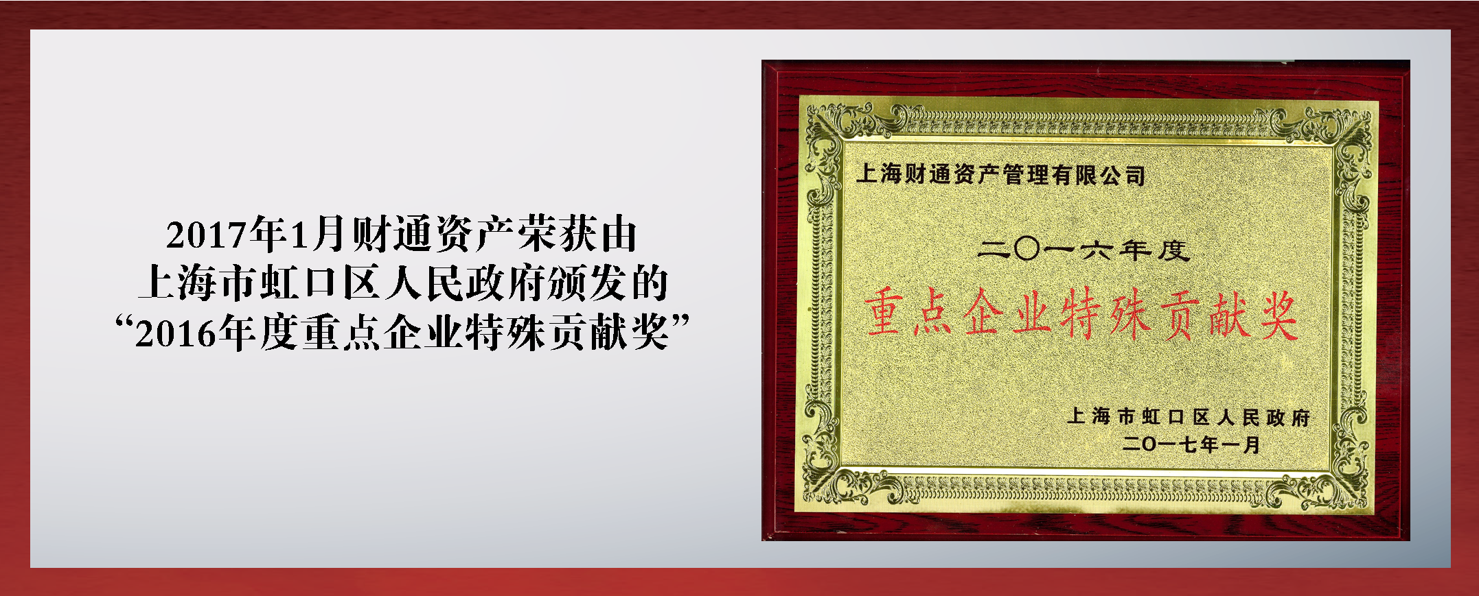 2017年(nián)1月(yuè),财通(tōng)資産榮獲由上(shàng)海(hǎi)市(shì)虹口區(qū)人(rén)民(mín)政府頒發的(de)“2016年(nián)度重點企業(yè)特殊貢獻獎”;