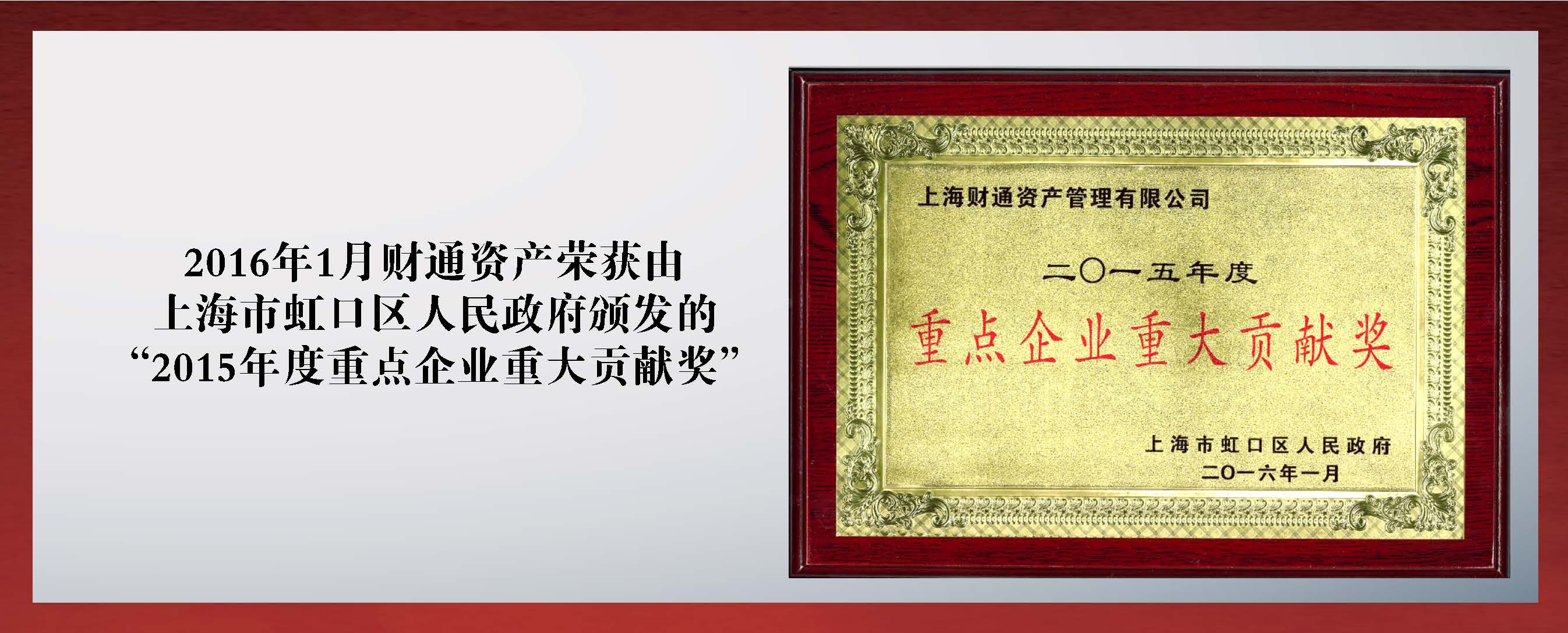 2016年(nián)1月(yuè),财通(tōng)資産榮獲由上(shàng)海(hǎi)市(shì)虹口區(qū)人(rén)民(mín)政府頒發的(de)“2015年(nián)度重點企業(yè)重大貢獻獎”;