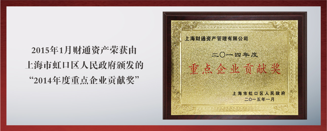 2015年(nián)1月(yuè),财通(tōng)資産榮獲由上(shàng)海(hǎi)市(shì)虹口區(qū)人(rén)民(mín)政府頒發的(de)“2014年(nián)度重點企業(yè)貢獻獎”;